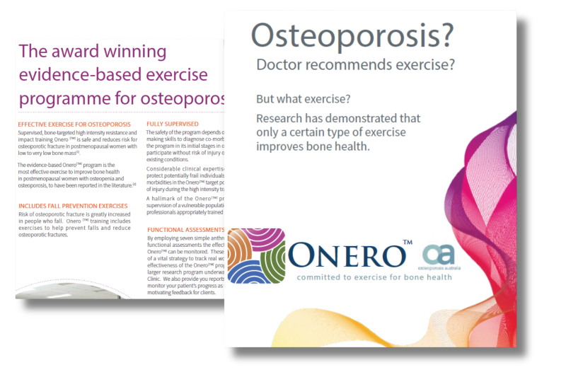 To be safe and effective the program must be supervised by a physiotherapist or accredited exercise physiologist who is trained and Licensed to deliver the program. Our Clinic is now Licensed to deliver ONERO® to our clients with or at risk of osteoporosis. ONERO® is appropriate for adults of any age wishing to reduce their risk of osteoporotic fracture.